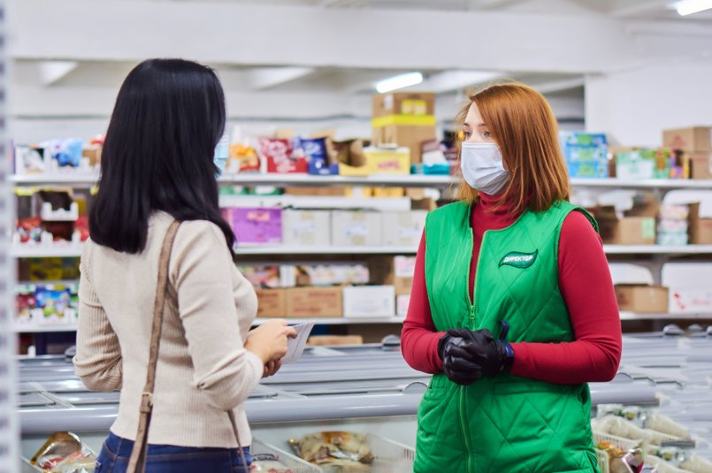 Алена рассказала об организации работы darkstore в условиях пандемии. По словам специалиста, за одну смену торговый зал обрабатывают каждые два часа: кассы, все поверхности, дверные ручки. Весь персонал интернет-магазина работает в масках и перчатках, которые они меняют каждые два часа.